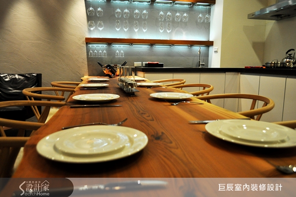 在用餐空間擺上長型檜木桌,讓檜木香與酒香、美食交織出誘人的香氣,而這正是設計師想強調的信念,比喻在此歡聚的都是「氣味相投」的好友們。牆面四周則塗上珪藻土,展現出不造作的氣息。設計師以自然素材來襯托好酒、好食的好空間,讓人感受到這處好宅,傳遞出讓人沉醉的迷人氛圍。