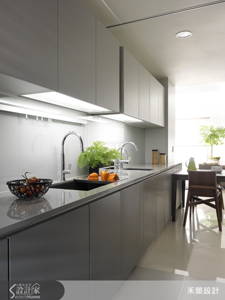 04 餐廚的空間魔法 : 開放式廚房將工作檯面與餐櫃延伸到餐廳,運用玻璃隔間拉門,機動性的銜接或區隔餐廳區塊,能更靈活的運用空間,又解決了油煙四溢的問題