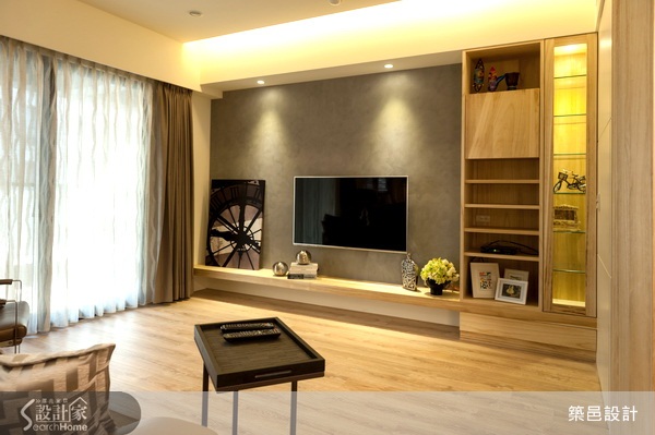 07 電視牆面造型簡單而不繁複,灰色馬來漆穩重的質感搭配溫潤的木質,與一旁收納、展示兼用的櫃體,語彙出空間的人文品味