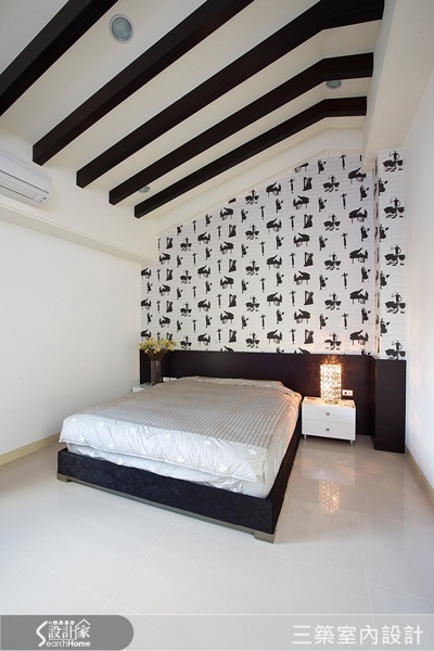 03 黑材橫於白色天花板之間,對比黑白壁紙、黑白家具、房飾,呈現出簡約的雋永優雅