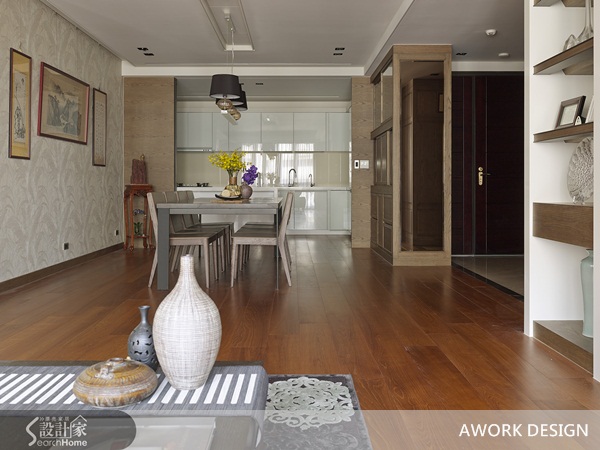 02 字畫背後的空間看似與客廳區隔,實則可藉由收攏移動式木牆、玻璃門,開放出此空間,讓屋主得以視情況需要自由更動
