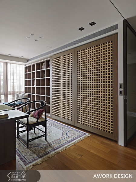 07 極具東方感的格紋木門豐富了視覺的美感,更能藉由門的開與關,有效運用空間