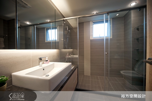 玻璃作出乾濕分離的淋浴區隔,利用洗臉台造型、鏡面與間接照明與磁磚配色,浴室也能營造簡單美。