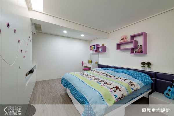 09 一條是明顯的弧線,另一條是紫紅圈連成的虛體弧線,交錯出輕靈的美感。床頭上方的不規則方形,不但具裝飾房間的功效,更是絕佳的置物空間
