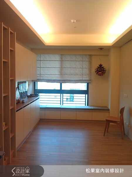 書房簡單清爽,木地板可讓人在此休憩閱讀,或提供為孩童嬉遊的場地,窗邊的收納櫃組加上了軟墊可做為座椅使用,也可悠閒躺下欣賞窗外藍天。