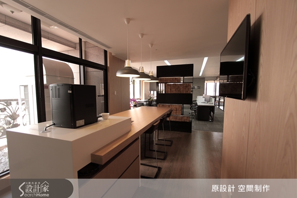 部分隔間牆運用黑色鐵件打造的框架,搭配透明玻璃取代實牆,讓空間更具穿透性,放大空間感,除此之外,運用淺色木牆面打造的隔間牆,則為空間增添幾分樸實溫潤的氛圍。半開放式的茶水間,簡約時尚的吧檯和燈具搭配黑色櫃體,創造溫馨的休憩空間,在工作之餘能有個放鬆紓壓的小角落是多麼幸福的事!