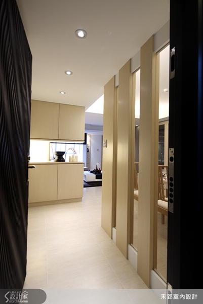 打開極具現代風格的大門之後,迎面就是舒服的木質暖度。玄關右側鑲有玻璃的牆面,不但依功能區隔了空間,更保留了視覺的穿透寬敞
