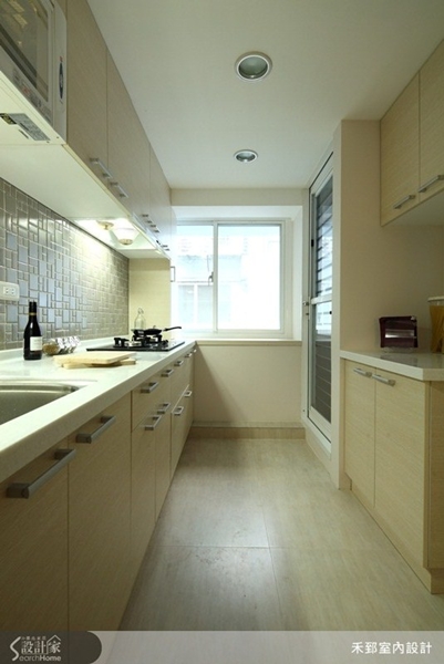 淺色木板搭配銀色的幾何壁磚,使廚房的空間更形活潑、豐富
