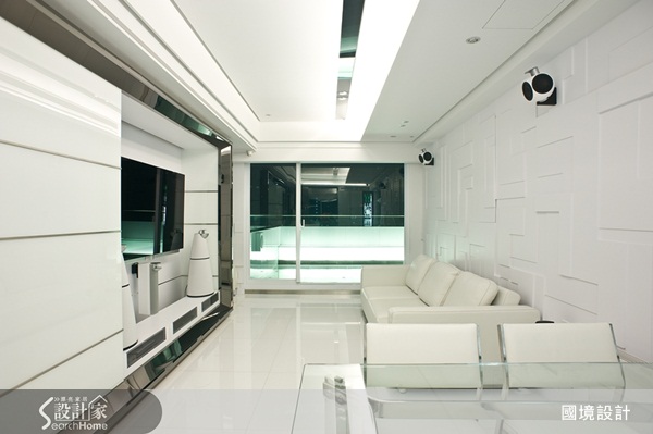 06 以不規則如魔術方塊的牆面,營造出俐落的動感,搭配簡單而俐落的白色烤漆與白色家飾,讓客廳呈現出科幻感十足的現代風格