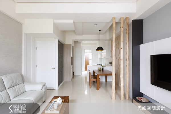 別具巧思將自然的原木帶進屋內,使客餐空間有了森林的氣息,更讓空間有了明顯區隔,展現出設計師細膩的刻畫。餐廚空間,則是以時尚中島吧檯來突顯主題,以樹剪影為浮雕的背景,讓人有種在森林用餐的驚喜感。