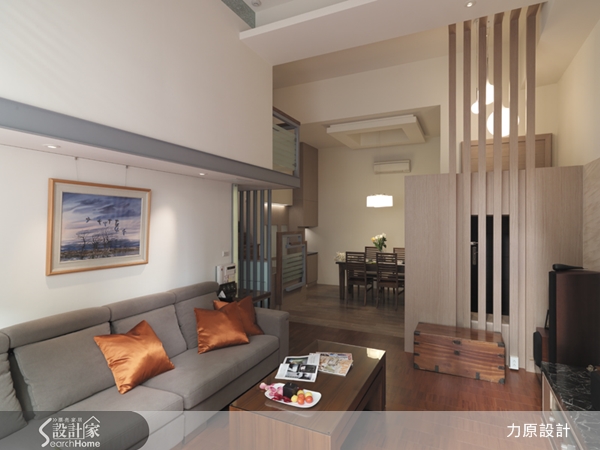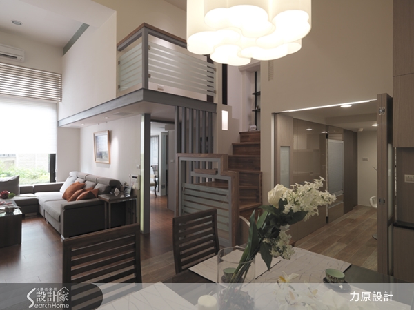 客廳以玻璃和大面牆作線條層次分隔,不設大型櫃體的家具,讓空間擁有適當留白,視覺上具有放大穿透感。餐廚空間與客廳以不同木紋地板作區隔,廚具主題色以白色淺色調,更顯清爽輕盈感。臥室區床頭則均以窄櫃線條呈現,並沿著室內隔間線條設計最大的收納空間,整體上均以簡單俐落的線條,來克服夾層所可能產生的壓迫感問題。