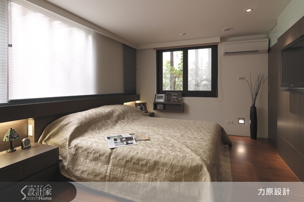 臥室床頭以窄櫃線條呈現,並沿著室內隔間線條,設計最大的收納空間。