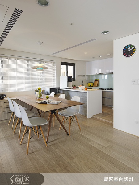 02 另一種配色建議,使用木桌搭配合成材質的白色餐椅,簡約中透露著些許設計感,開放式的廚房讓視覺更加寬敞,動線也十分流暢。
