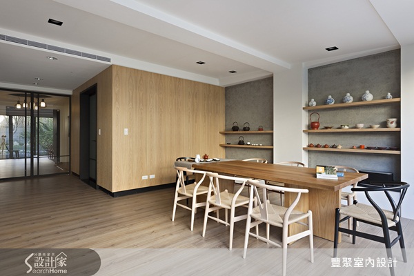 05 與第一個案例有些許類似,同樣以木材質搭配清水模兩種混合使用,散發出略微冷調的寧靜感,較低的桌面可展示牆面的陶瓷工藝品,讓人在此用餐或品茗閒談時,也能賞玩主人的收藏。