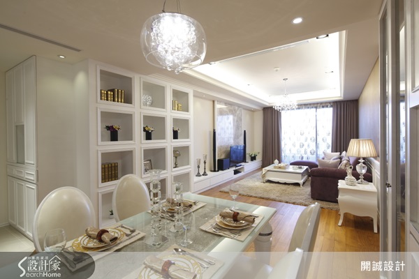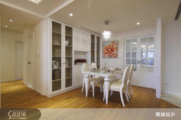 從另一個角度看,更能感受客餐廳開放的視覺寬敞性,空間以白色呈現高雅簡約,在裝飾中注入些微古典元素,營造新古典風的低調奢華。