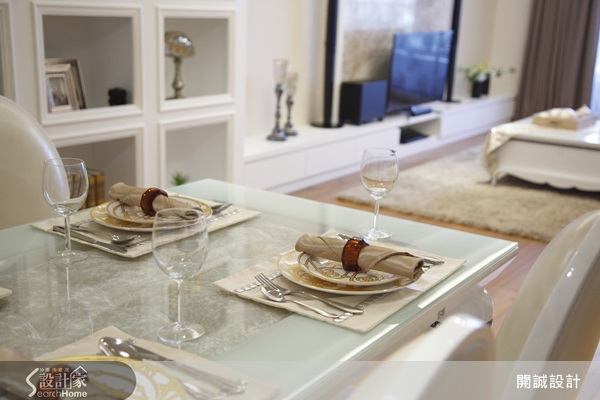 餐廳區的收納櫃組帶有美式氣息,使用圓形餐椅,玻璃桌面,讓光影反射營造奢華感,加上餐具與桌巾的搭配,低調奢華的新古典風其實也不難。