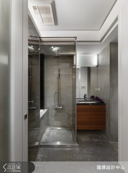 06 衛浴以水泥牆面和地面,搭配木紋洗手檯,既人文又有不做作的自然感