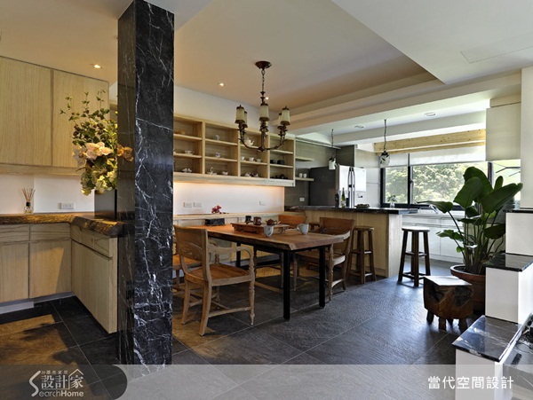 02休閒風 木石本來就是休閒風不可或缺的題材。運用體積較大的黑網石柱和大量的原木色餐桌椅、櫥櫃,則能營造一種更為原始的自然情懷