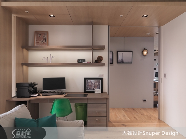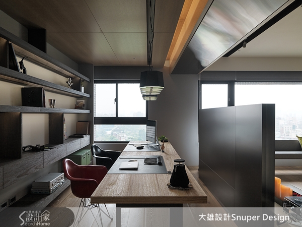 回歸空間的本質做為設計的初衷,期望以穿透、流動拉近使用者和空間的親密關係,設計師因應簡單生活的家庭成員,拿掉一房隔間,透過開闊明朗的公共領域,營造空間氣度,並考量到年輕屋主對設計的接受度大,將進門玄關處,透過懸空的噴砂及清玻璃交錯,在半遮半掩的曖昧之間,挑逗進入空間之前的好奇心,電視牆則選用科技感的金屬材質,以延伸感為目的,不做滿至天花板,呼應沙發背牆典雅的卡拉拉大理石,形成潮流與高雅玩味的精彩對話,而書房的開放式書架,放置屋主旅遊寫真和潮流收藏,並同時重視高度的表現,將一支橫亙天花板的主樑,夾上木皮封板和鍍鈦板,化缺點為優點,將樑柱變成天花板上的亮眼藝品,於設計上處處點綴玩心,古樸的木質設計和現代俐落的建材,形塑出獨創的工業時尚風格,看似乾淨的空間設計裡,縝密布局建材的分布,融屋主收藏的潮流公仔、旅行攝影、藝術畫作,濃縮拼貼一則精彩家的故事。