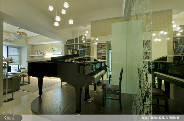 因為屋主從事鋼琴教學,所以整體的空間配置將跳脫傳統兩廳的設置,以鋼琴區作為全屋琴聲飄揚的空間,同時在鋼琴四周設置鏡面,讓學生能夠清楚看到老師指法。而鋼琴下方的隱藏式吸音棉能降低音量,彈鋼琴時才不會對鄰居造成困擾。