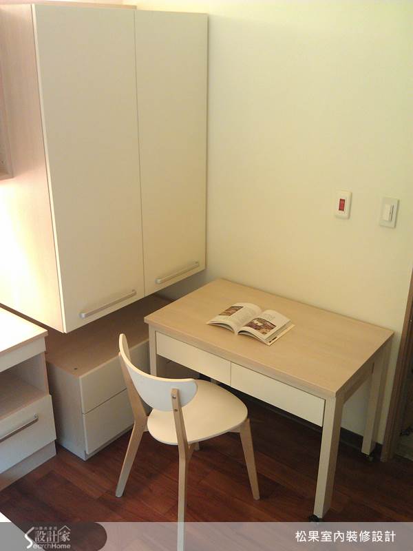 小孩房坪數為2.5坪,底板為深色木紋地板,因此設計師採用白色為房內主色,希望空間能顯得輕盈沒有負擔。同時為了幫小朋友打造適切的書桌與衣櫃,先以床頭箱與床底抽屜式收納櫃,強化小坪數內的收納機能,讓小女孩日後不管到幾歲,都能靈活運用這些收納櫃,書桌可收納到櫃體之中,讓空間使用更加多元。來到小姑房,小小的2坪空間,因為有了高收納機能的衣櫥,讓小姑可以輕鬆收納不同季節、主題的衣物,化繁為簡的設計,讓小坪數空間顯得寬敞不擁擠,展現出簡單就是美的雋永質感。