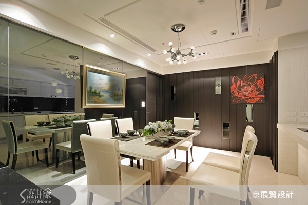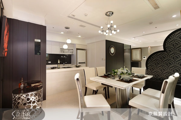 客廳的主視覺為祥雲造型的電視牆,它不僅區隔了半開放式的客餐區,更緩和了原始牆面間的不協調之感,同時解決了風水的煞氣問題。而在用餐區的部分,設計團隊運用了大片的鏡面,藉此開拓了視野。而半開放式的空間設計,也使得動線更形流暢。
