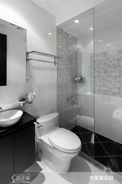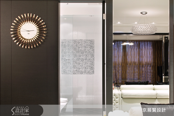 簡約的深色牆面,以造型時鐘搭配霧面浴門,營造獨特的氛圍及高雅的美感。