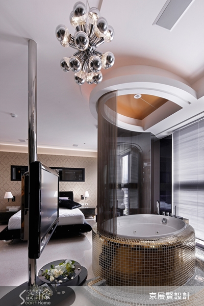 而在私領域的部分,除了以各種時髦配件組成的主臥空間外,設計團隊更巧思運用金色的馬賽克拼貼,打造出一座蛋形浴缸,不僅更提升了整體的空間質感,更將一抹沉穩優雅注入室內,塑造出獨特華美的都會氛圍。