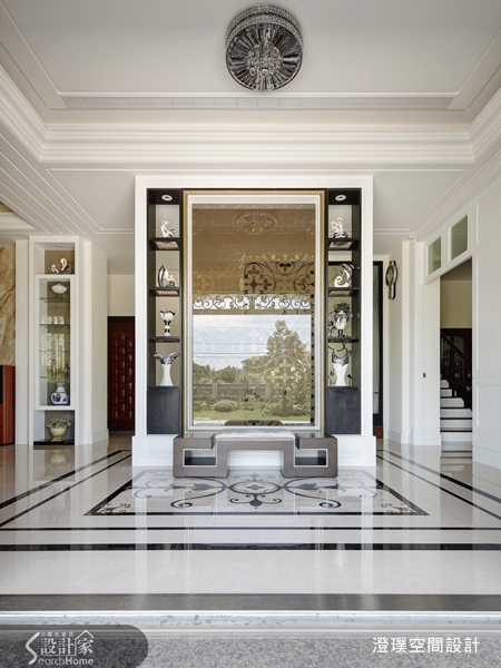 以鏡面延伸視覺效果,再以對外窗引入光源,同時營造出視覺的穿透性。而古典沁美的水晶燈,更為此空間注入了一股華麗的美好氛圍