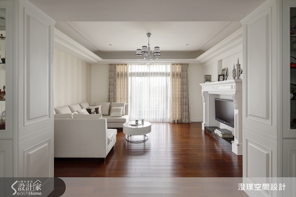 以壁爐造型呈現的電視牆雋永大方,搭配簡約的低調白色系,營造出空間的優雅質感