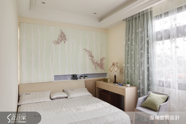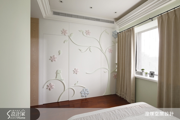 二樓的設計則和一樓風格不同,改注入女兒喜歡的美式風格概念,在公共領域以簡約的低調白,加上壁爐造型的電視牆,呈現出空間的優雅質感。而臥房則依各使用者的需求與喜好量身訂做,據此呈現家中每一成員的個人風格。如此巧妙的設計手法,不僅讓家中成員能優游自在於各自所屬的私人空間,更能在進入公共空間時,享受一家天倫之樂的幸福美滿。