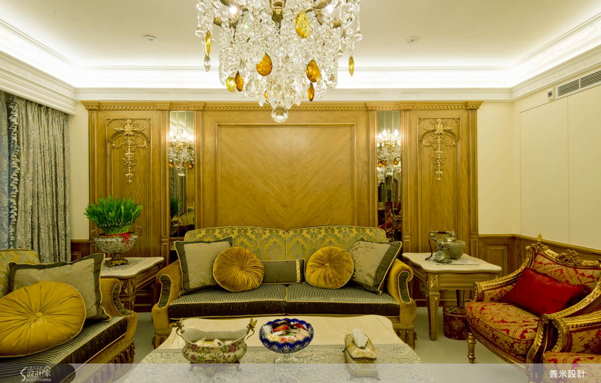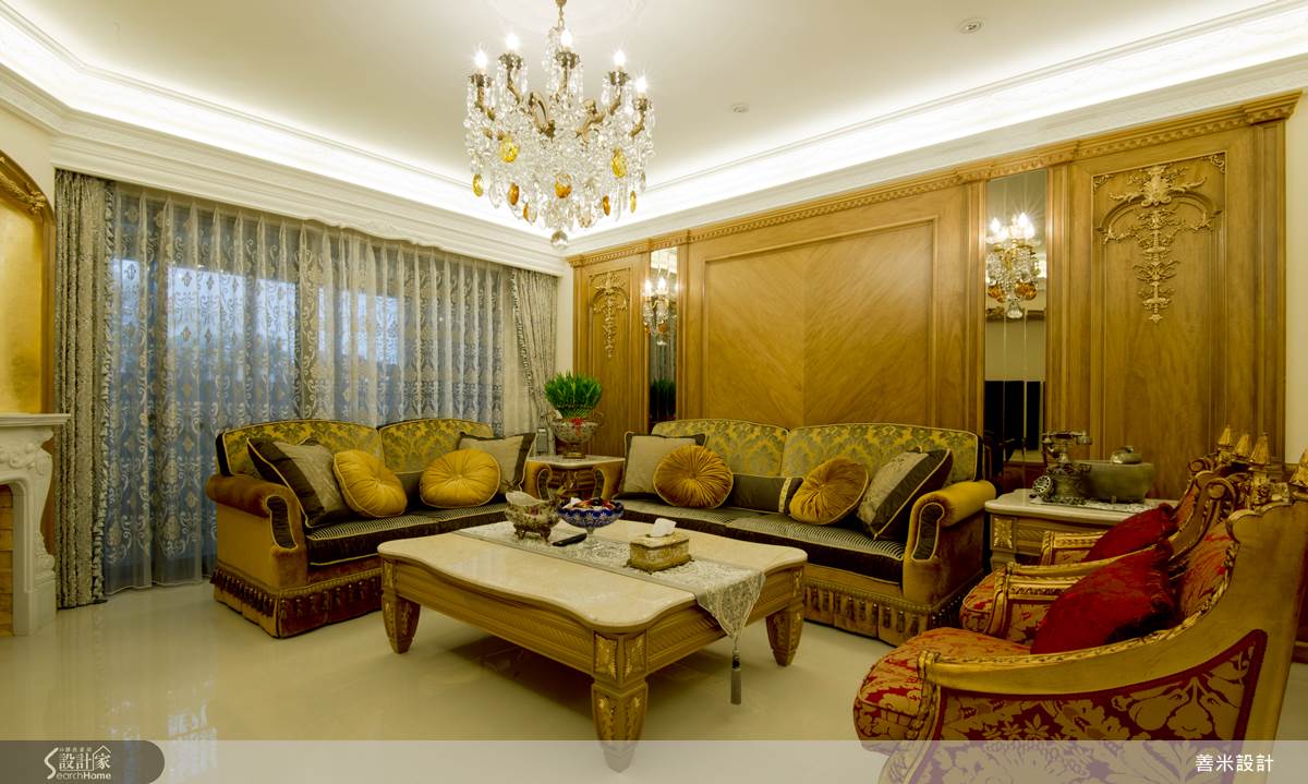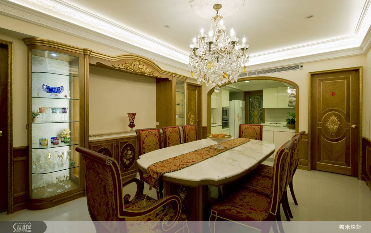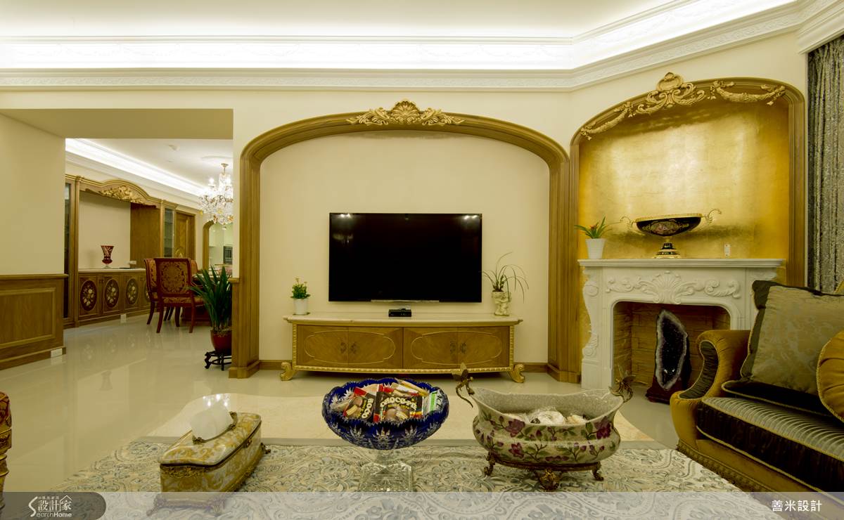 玄關處使用沉穩色系的大理石及金色耀眼古典家具,展現出尊貴、輝煌的空間語彙;客廳空間承襲古典大器的設計風格,電視牆使用圓拱造型,帶來華麗古典的姿態,也在右側規劃了一處使用金色打底做的展示區,隨著圓拱上典雅的符碼、白色的展示櫃,將奢華的色彩調和的更加穩重、更加耐看,沙發背牆在實木牆上崁入兩面明鏡,讓高掛的華麗水晶燈,映照的閃閃發亮,化解空間沉重感也增添穿透特性;餐、廚空間使用開放式設計,利用中島吧檯做為之間自然的交界,廚房入口的拱門造型,也讓空間更顯優雅風格;起居空間利用深色木結構襯托絨布寢具,營造出空間優雅氣質,打造舒適、溫暖的居家。