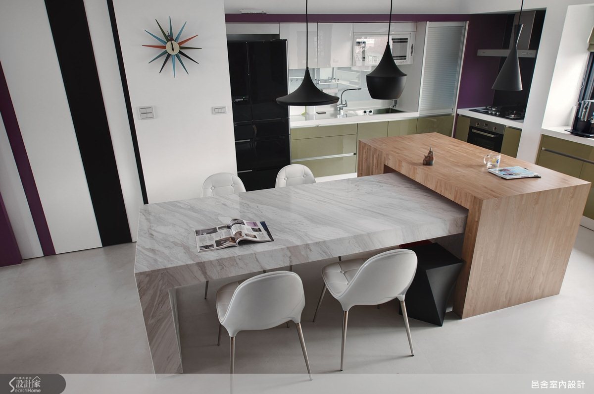 中島型吧檯藉由大理石與木頭異材質的結合,呈現出冷暖調的完美協調性,隨著光線流竄於室內,盡情地展現出居住場域的迷人景致。