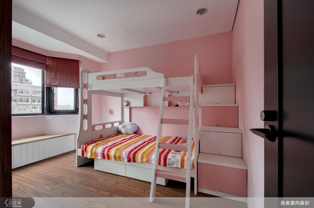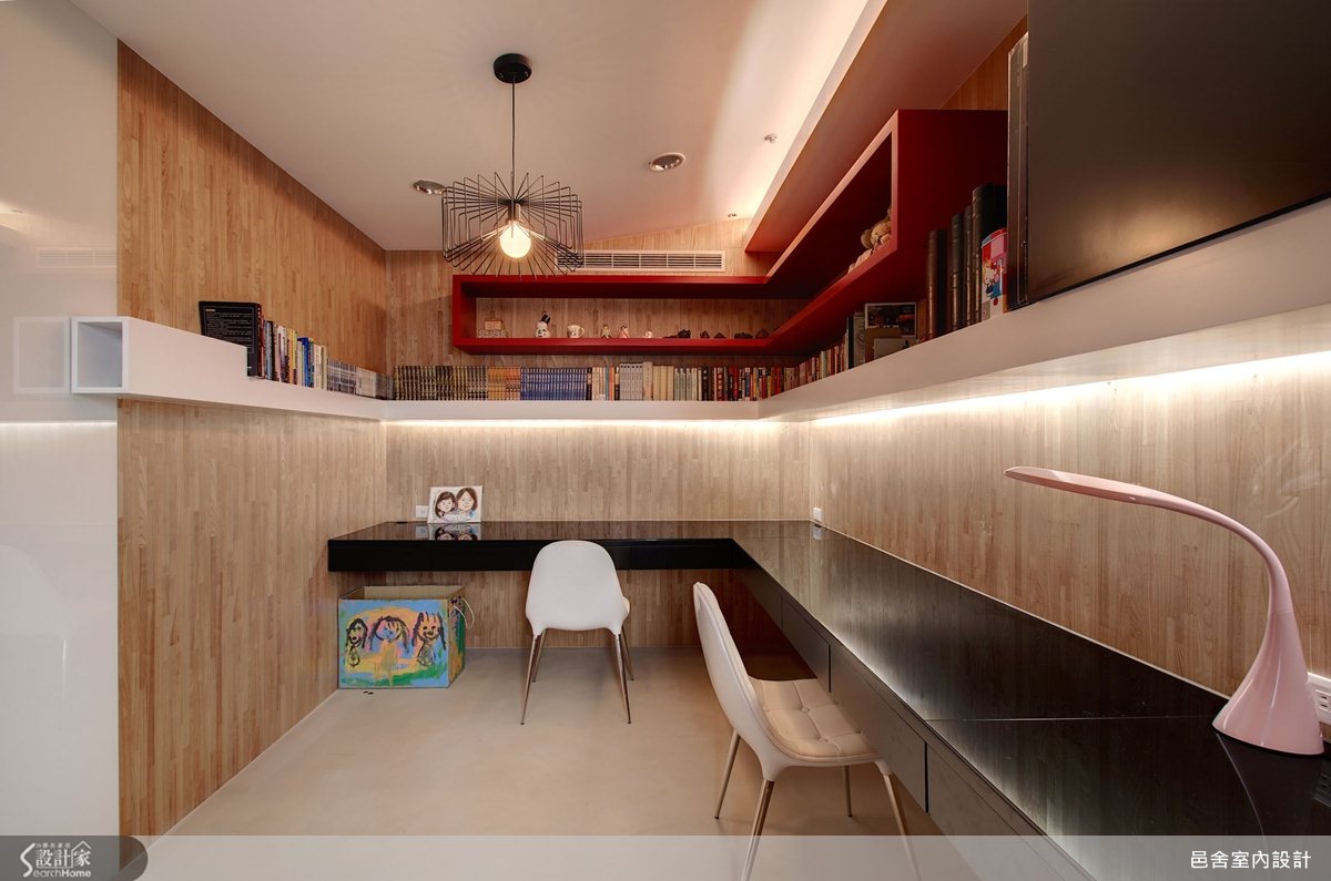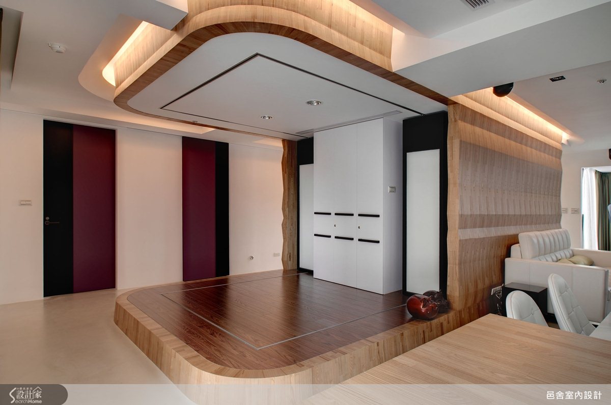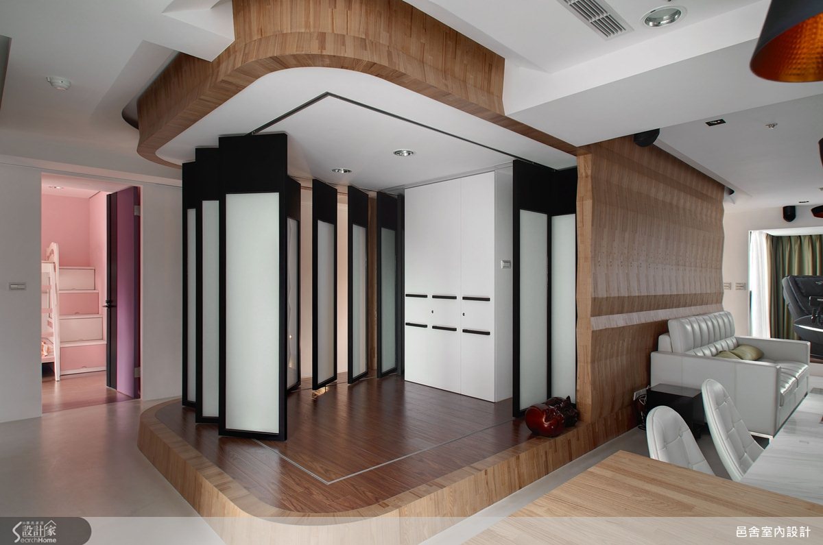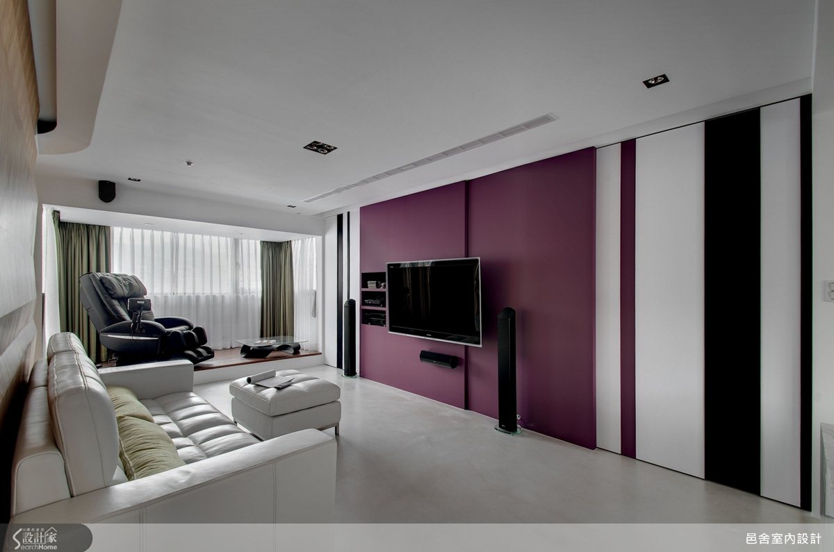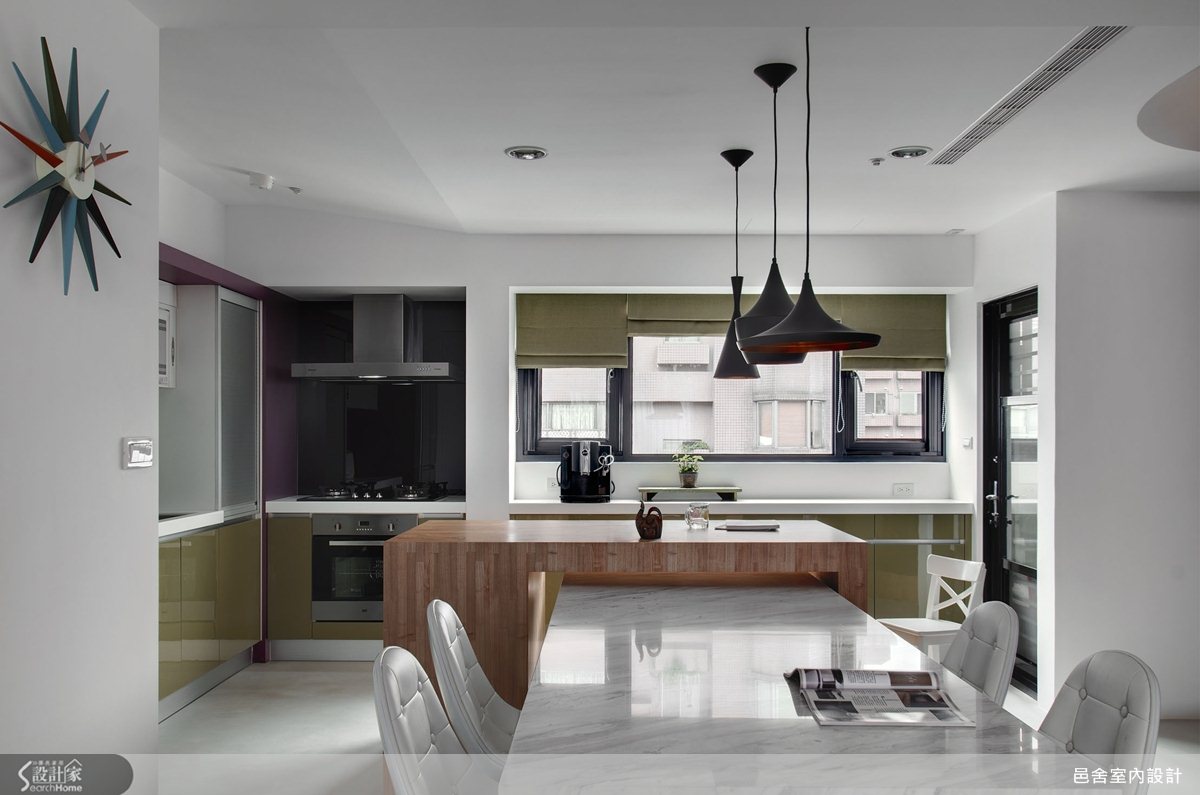 位於台北市大直 40 坪的現代風中古屋,翻新之後展現出豐沛的活力感,客廳選用白色傢具,搭配紫色電視牆,讓強烈的顏色對比為空間注入既活力又浪漫的氣息。開放式的餐廚區域,兼顧了美感與實用的考量,以紫色與草墨綠色為主色,拼出活力感十足的櫥櫃,而中島吧檯則以銀狐大理石與木質相搭配,結合黑框造型吊燈與牆上光芒狀的時鐘,突顯朝陽般活力又輕盈的現代質感。在房子的中央是回字型的木作量體,不僅僅能引光入室,同時也界定了空間動線。臥室區域則延續著公共空間的色調與風格,以大幅桃紅色與粉紅色區塊,分別營造出暖感放鬆的主臥房與童趣活潑的兒童房。而被包覆在木作空間中的書房,以紅、黑、白三色搭配,除具有閱讀功能,還可以在此塗鴉、練舞或表演。