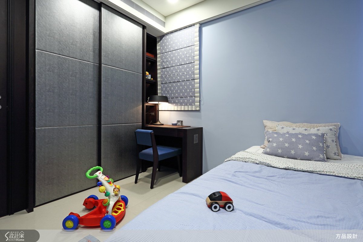 本案位於高雄,入門玄關可見到牆面裡的展示平台,呈現美好的藝術端景,公共空間以大片窗戶引入陽光,捲簾透著自然光線,形成舒適的氛圍,客廳以低調的灰做為電視牆面,增添沉穩的質感,天花板獨特的燈光設計,為空間製造視覺焦點;餐廳位於落地窗旁,可讓人邊用餐、邊賞覽陽台景色;廚房區域將部分壁面鑿空,將冰箱推入置放,藉此節省地坪空間,天花板以溫潤木質鋪述,對應底下光潔的白色吧台,形成清爽的餐廚區域;臥房運用大片落地窗搭配草綠色窗簾,增添簡潔休閒的感覺,床頭牆特殊的咖啡色花紋展現低調質感,與隱藏式推門拼接成一道平整立面;小孩房以粉藍作為主要色調,角落的木質小書桌結合牆面收納櫃,打造出L型的流暢線性設計。