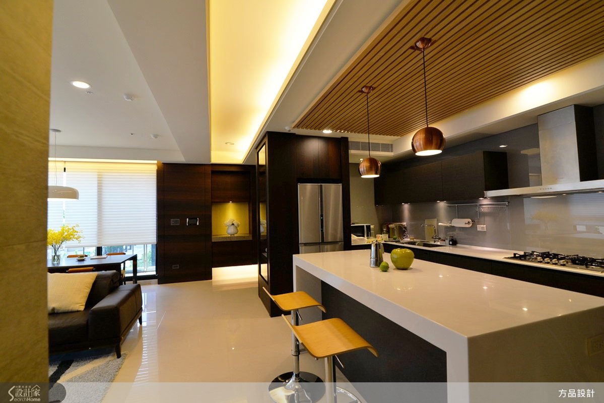 開放式的客餐區,以時尚的中島吧檯自然的作為交界,簡單低彩度的白色系為主要用色,特別的是在天花上設置了木條骨架,豐富了空間表情,也讓餐廚空間感更為延伸,相當適合在此與家人喝茶、談天,閑靜地在此度過一個夏日午後。