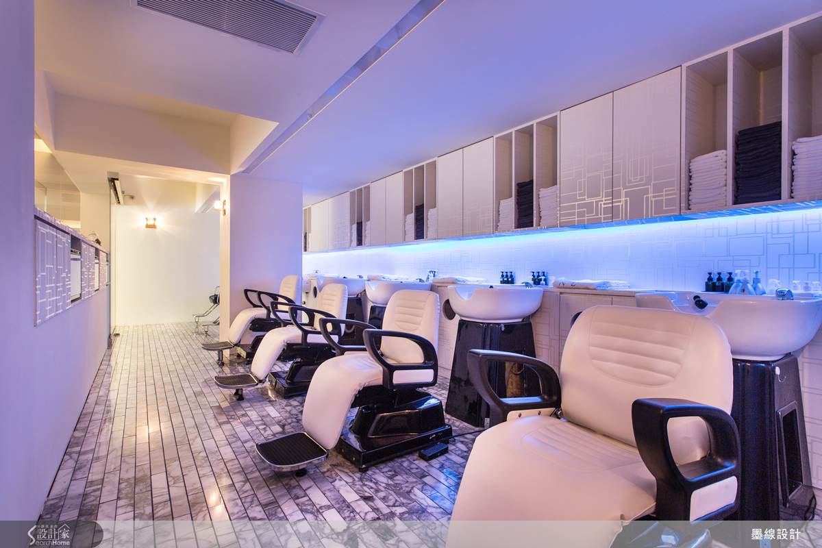 在門面設計上使用大面紅色鏡面,創造品牌顯眼又熱情的視覺端景,讓人不得不駐足停留。鏡面中反射著周邊環境,讓樹影、陽光、街道,彷彿對話般自然而生動。走進髮廊後,接待台主牆延續主體色彩,鮮紅色鏡面創造出強烈視覺端景,與淨白的接待台一同營造出前衛專業的氛圍與信任感。等待區與工作區藉由高低差檯面自然形成等分野,同時在層板下設置光源製造情境、增添氣氛;等待區倚靠在透明窗戶旁,讓自然光、空氣、植栽綠意恣意流串於寬敞的空間中,讓消費者舒服地等待著即將煥然一新的改造。工作區以自然大地色系為主要色調,粗獷刻意未經裝飾的天花板樑柱與淺色木地板,提供了自然不造作的紓壓氛圍。座位間隔則以利用整面直立明鏡創造適度寬距,讓客人不會感到壓迫拘謹;沖洗區利用藍色 LED 燈光營造放鬆的紓壓空間,讓客人在進行沖洗服務時更能放鬆身心。