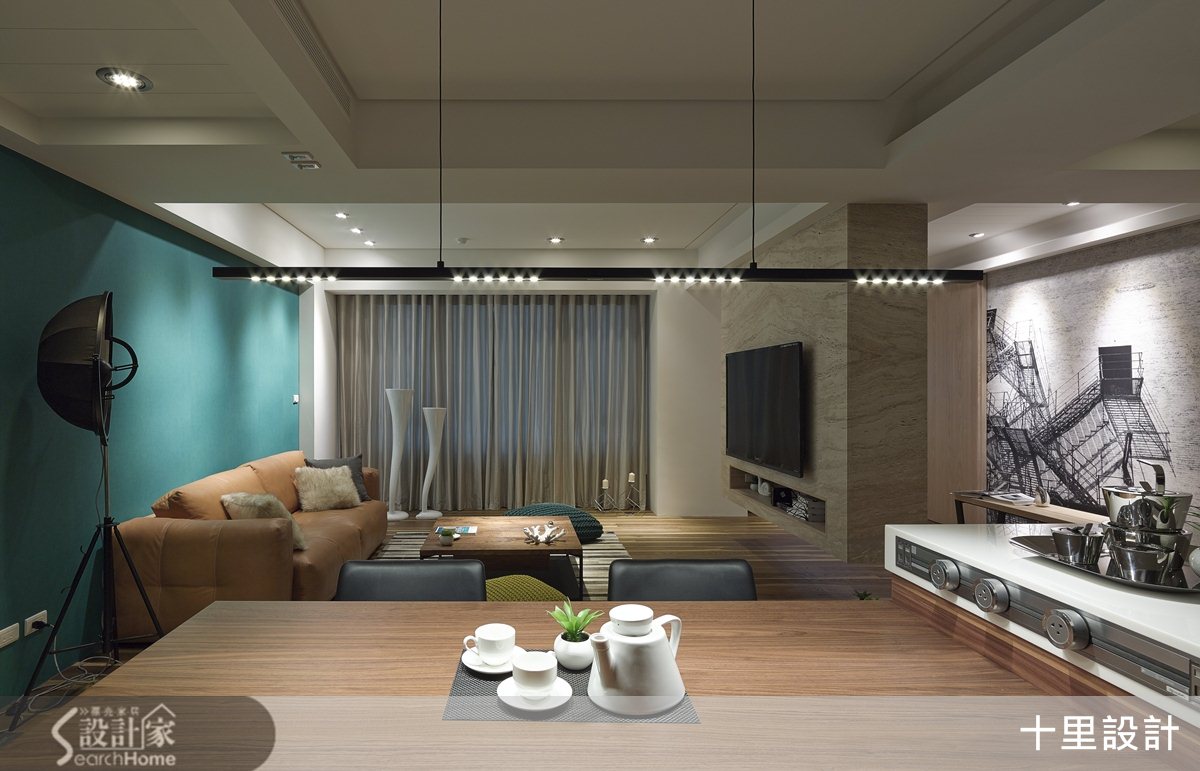 首先映入眼簾的是大面落地窗將戶外明亮採光注入家中,窗外美景一覽無遺,今天要分享的案例位於台北市區的舊屋改造,聆聽屋主對生活品質的追求,設計師結合混搭媒材相互交融,將現代人文的設計概念,成為屋主理想中的夢想宅邸。懸空設計的電視主牆,成為開放式客餐區的最佳焦點,採用大理石材打造,懸空的巧思賦予輕量感的意象,顛覆了傳統電視牆的設計框架,迷幻的藍綠色沙發背牆,如夢似幻的成為屋主嚮往中那休閒放鬆的海洋色調,宛如深呼吸就可以感受到碧海藍天的圍繞;一牆兩用的電視牆,奇妙的區隔後方空間,變身為休憩閱讀區,因應屋主收藏的藝術品,將收藏品放置電視牆後方的收納層板中,同時休憩區的背牆也是區隔臥房空間,將活動拉門的底層設定黑白的工業風圖作,讓家化身為當代風格的藝術館;隨著深色木紋色系的步伐前進,到了開放式的餐廚空間,地坪由灰階地板取代,營造出低調異材質的強烈印象,吧檯延續餐桌的擺放設計,顯得閒適又沉穩,一整面主牆使用明鏡的創意設計,具有穿透的特性讓視覺更加通透無阻礙。