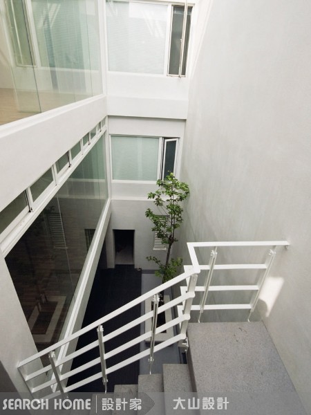 100坪空間的透天別墅。原始建築格局僅能提供屋內前後採光,為符合屋主的需求,設計師與建築師通力合作,轉移並改造建築體,使得改建後的屋宅能呈現出嶄新的量體結構,以幾何重疊的方式建構出白色的建物主體,並巧妙將建蔽率與容積率轉換成前院與中庭的天井,使得看似戶外的空間卻能讓室內充分延用,大大提升了建物使用及裝潢的可能性。