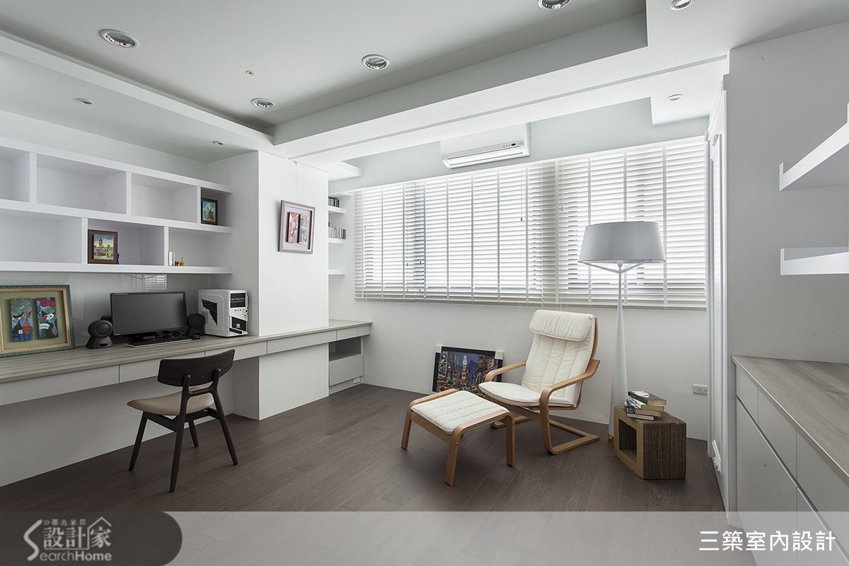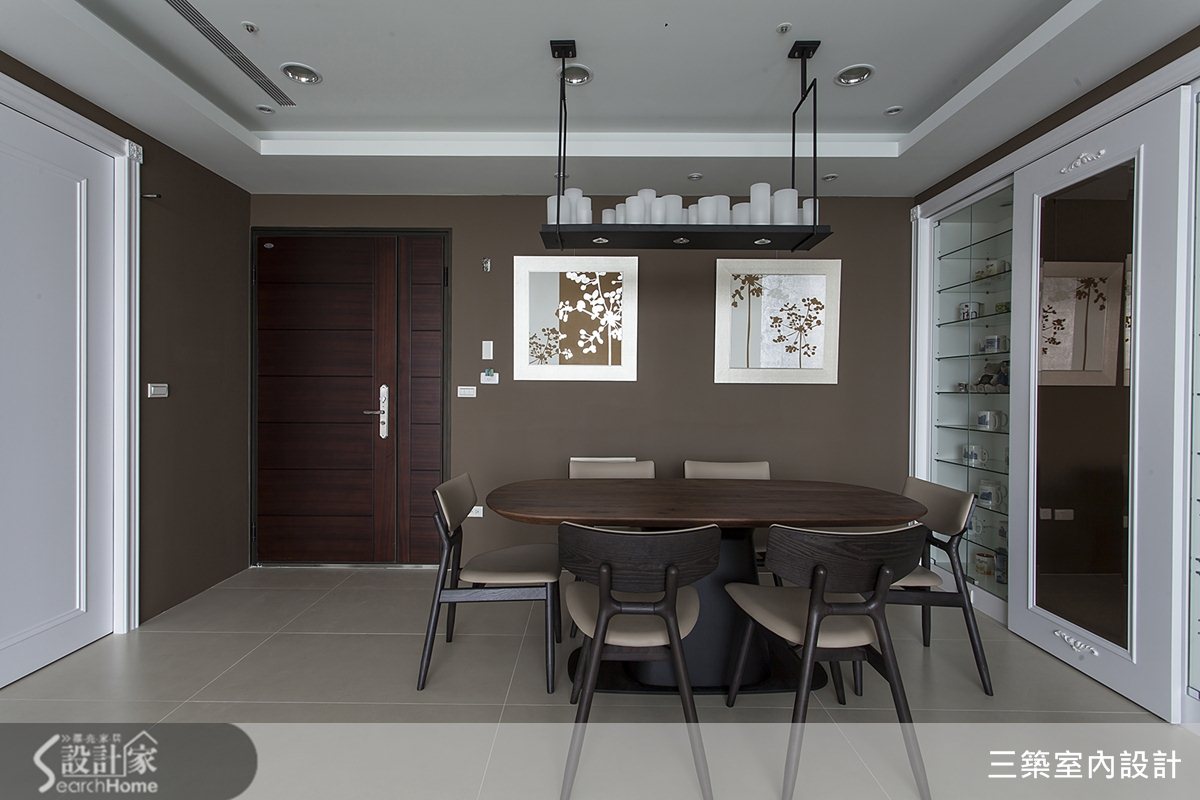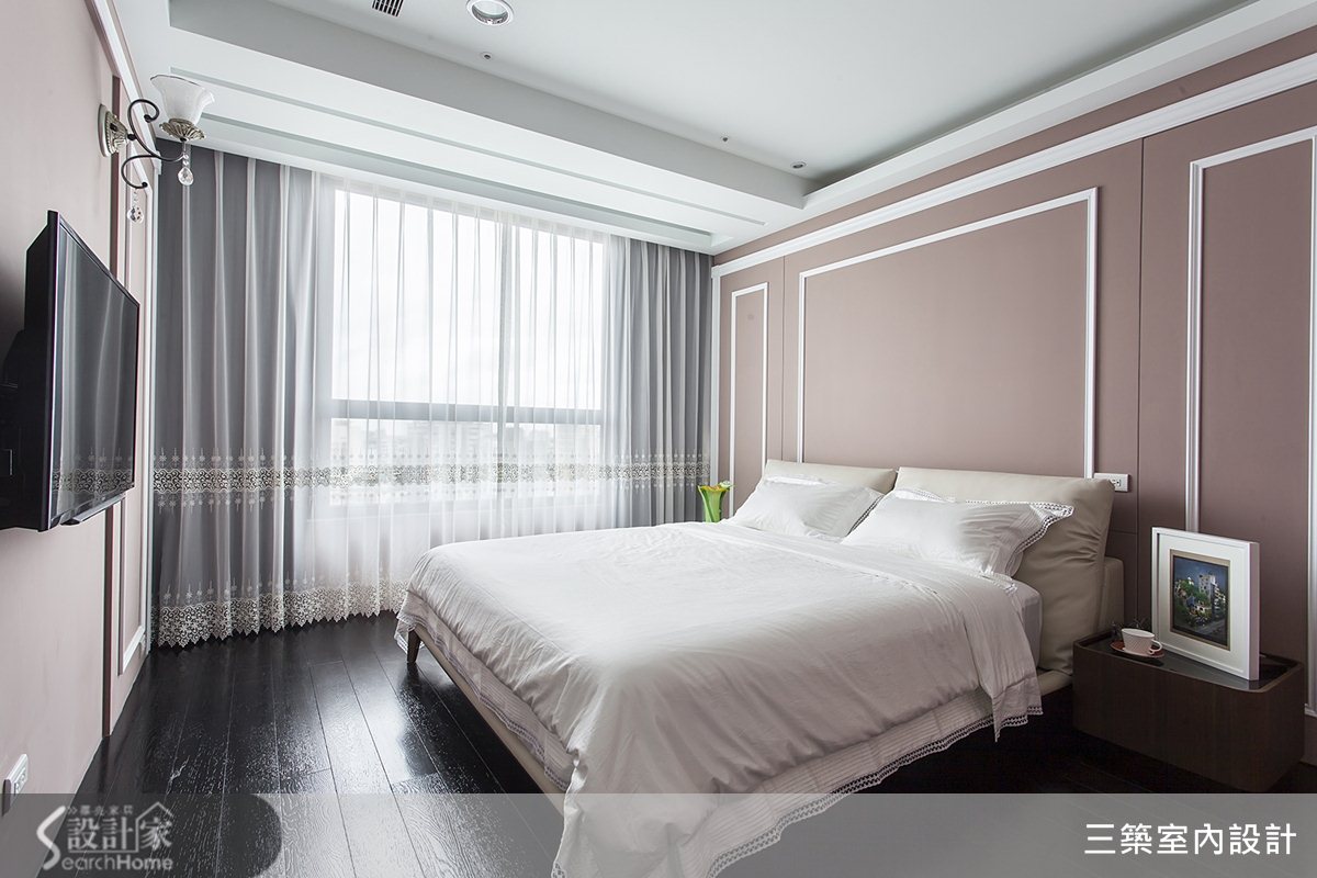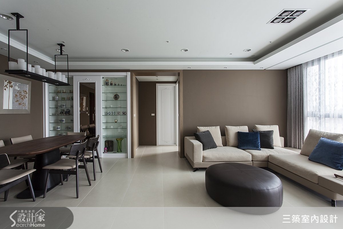 在此屋為毛胚屋時,屋主即與設計師做好完善的溝通,希望以舒適寬敞的現代風格為主要訴求,但同時也保有收納機能的設計。因此,在相連的客餐廳區域,設計師主要以大地色為公共區域的主要色調,讓咖啡色的牆面與淡色大理石營造出簡約質樸的氛圍,再藉由花卉窗紗引入自然光,創造出無壓空間的舒適感;一旁的餐廳擺放著 6 人坐的實木餐桌椅,造型燈座與展示收藏品的白色壁櫃,則為簡單餐廳增添點活潑的氣息;充滿自然光的書房是女屋主最喜歡待的地方,以純淨的白色牆面與溫潤的木質地板,交織出清新靜謐的迷人空間,讓人不禁想多待上一整個下午。臥室區域則以粉色為牆面顏色佐以白色線框,同時搭配上兩盞古典風格的壁燈,來營造浪漫簡約的法式情懷,讓屋主在結束工作後,能使身心得到徹底的休息。