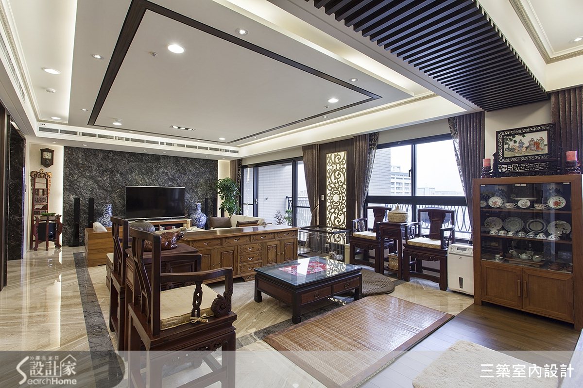 設計師在整體規劃上以簡潔大器為主要設計概念,並善用不同材質與裝飾元素碰撞出火花,襯托出古董家具的風采與意境。融合優雅細膩與靜謐自然等方式,來呈現東方文化內涵與歷史,客廳區域以深色大理石電視牆與簡約舒適的沙發,來突顯出古董花瓶的彩度與造型;而客廳後方的沏茶區,藉由太師椅與傳統木造的紅眠床,完整地傳遞出屋主對東方文化的熱愛。在紅眠床後方的牆面,則以金色書法融合花卉的壁紙設計,塑造出東方文化的藝術感,增添人文質感氛圍。臥室區域以沉穩的原木色地板與家具作為主軸,搭配花卉壁紙與紗簾,營造出自然優雅的休憩空間。