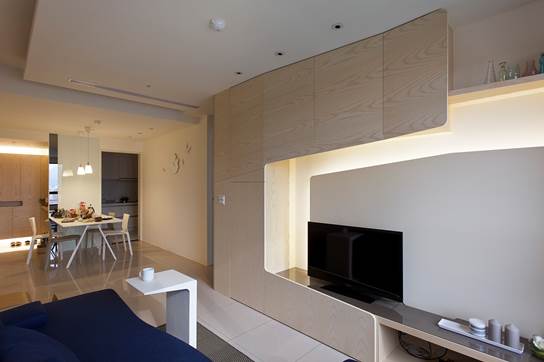 08 客廳的電視牆面結合櫃體設計與牆面美感兩種概念,利用木材質的清爽紋理營造視覺效果,同時也蘊藏了豐富的收納機能,完美呼應了清美學居家純粹無瑕的不凡品味
