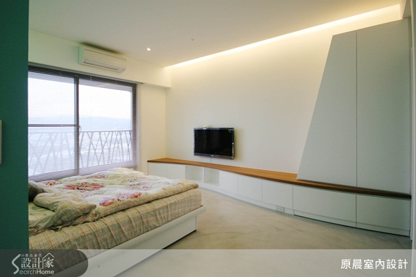 臥房電視櫃下的層板設計利用木質的溫潤調和現代風格中的冷調感。