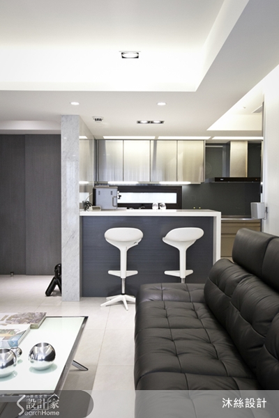 更改廚房位置,並且設計開放式吧台與客廳空間界定,讓原本狹長形的空間得以橫向發展,並且增加使用機能、視覺得以延伸、開闊,解決原本格局不良的問題。