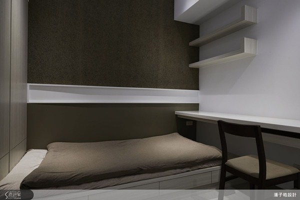小孩房的設計也是重點之一。配合小孩在家中成長,設計師在次臥的設計上,必須滿足從幼稚園到大學都能使用的機能性調整。像床組目前採低矮臥鋪,減少危險;臥室兼書房,書桌書櫃不能少;衣櫃則使用活動層板架,未來可以依據身高適時調整。