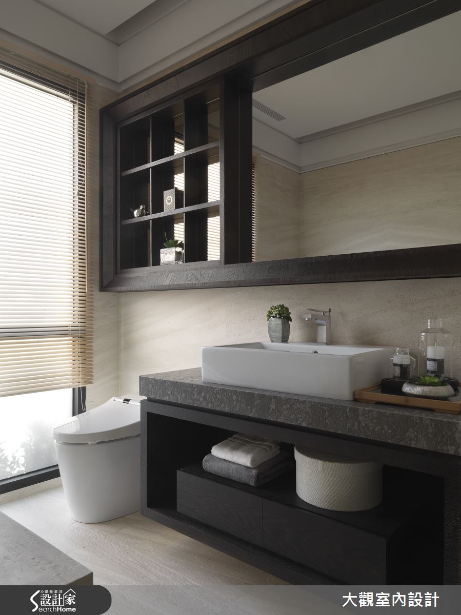 在衛浴中,設計師將鏡子結合九宮格置物櫃,充分利用牆面的每吋空間,且採用細膩的深色木質邊框做包覆,替空間帶入度假飯店的格調,營造紓壓感受!