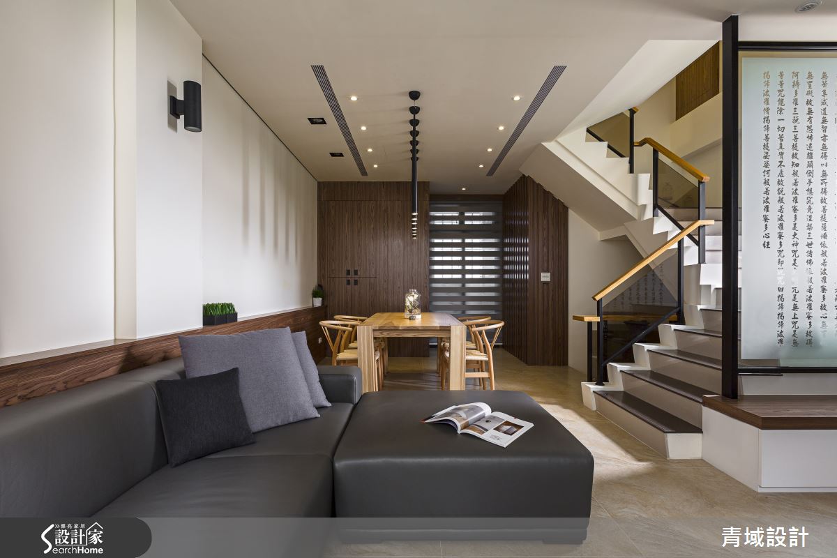 專為長期於大陸經商的夫妻量身打造偶爾回台的住所,設計師善用網路傳送圖片使屋主得以掌握工程進度,克服兩地溝通難題,將 85 坪現代透天厝注入大量恬靜自適的日式禪意,與兼具大量收納機能的現代感居宅完美調合。一樓客廳以長條型霧面玻璃柔化由大面積開窗的光線,使全然鋪敘超耐磨及海島型木地板的客餐廳空間區域明亮