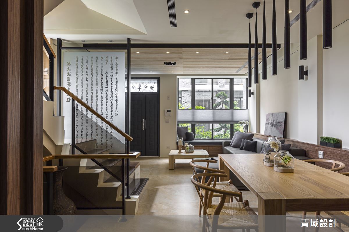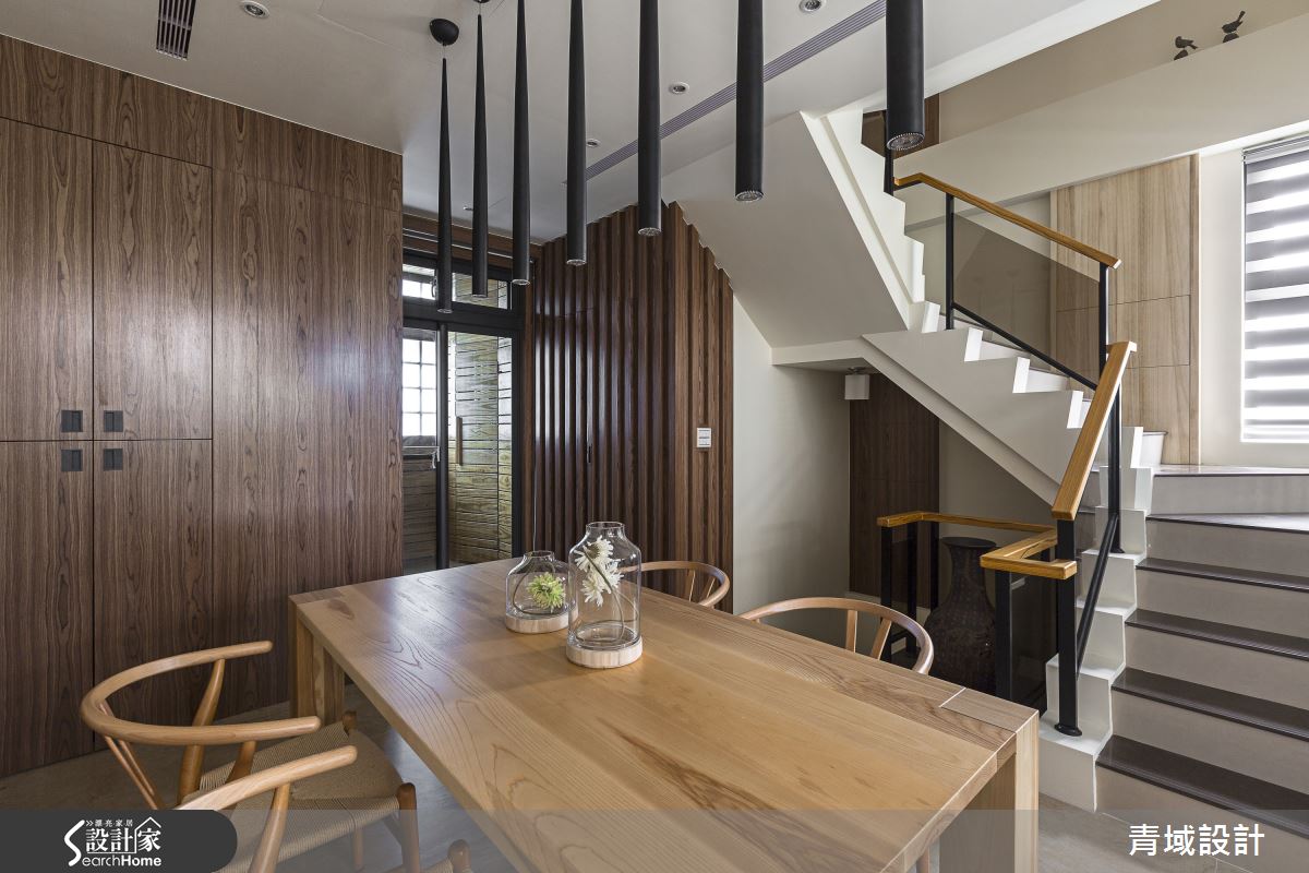 一樓客廳以長條型霧面玻璃柔化由大面積開窗的光線,使全然鋪敘超耐磨及海島型木地板的客餐廳空間區域明亮通透、視覺寬敞。配合屋者的風水要求,設計師利用下降式天花,讓客廳視覺與主樑齊平,搭配內縮做間照並混合嵌燈,為木感基底製造溫潤氣息。灰階沙發及窗邊附有收納功能臥榻,圍繞著實木茶几,為家人製造溫馨的休閒感。風化梧桐木電視牆延伸至上方下降天花色調,提高整體視覺明度。經過複印有書法作品的半透明屏隔,到達可供家人用餐、讀書與聊天等多元利用的餐廳,木質長桌為凝聚家人感情的最佳場域,造型懸吊吸頂燈彷彿禪意十足的風鈴,纏繞著家人間的輕鬆細語;餐廳後方的胡桃實木皮與格柵落地櫃蘊含大量收納機能,同時具有沉穩質感。