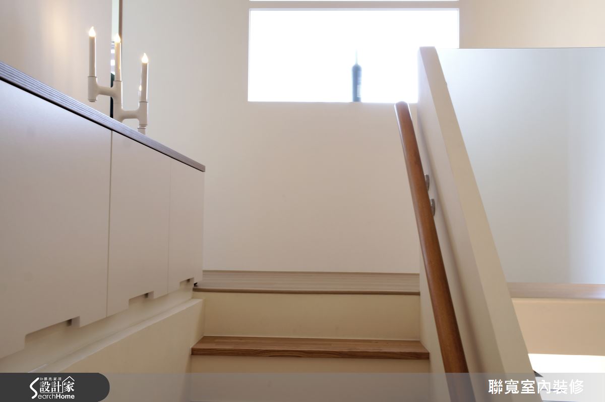 去除傳統磁磚沉重材質,設計師將階梯鋪上柚木實木踏階,搭配純白牆面,讓視覺空間更加純淨。各臥房皆以簡約、清爽的色塊作為牆面與軟件裝飾,搭配大型收納櫃體,抹去雜亂感;兒童房則以繽紛色調的收納櫃給孩子一個充滿童趣的空間。因應屋主需求,明亮大方的書房被滿是暖意的草綠色牆面包覆,更添生機盎然的旨趣。