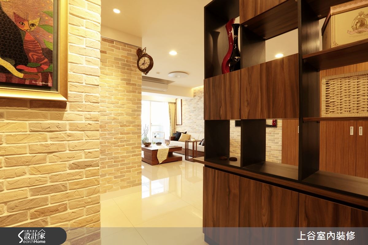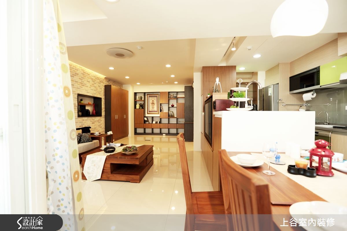 設計師根據空間性在部分區域使用了不同的建材來營造氣氛,像是沙發在背牆與通往私領域的通道皆選用了文化石,令室內的色調更加柔和與溫暖,廚房領域則是加入了蘋果綠妝點,使該區注入充沛的活力感!